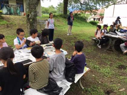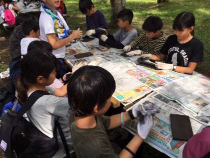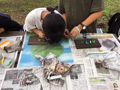 午後の活動は焼き板です。さわると真っ黒になるような板を磨いて、色をつけます。集中してやってます!