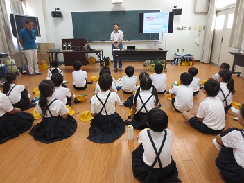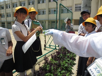 1学期末、環境局のご協力をいただいて4年生が「生き物発見教室」を行いました。ビオトープを中心に、校内の自然観察をし様々な生き物や植物にふれる活動をしました。普段は見過ごしていた植物を見つけたり、名前を知らなかった植物を知ったりと、発見の連続だったようでした。