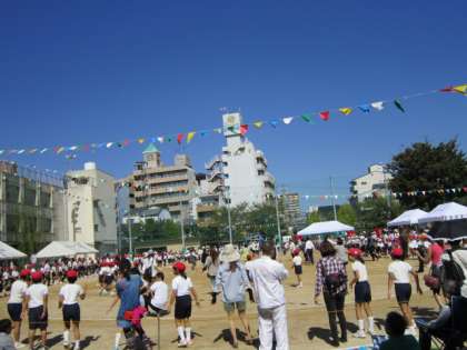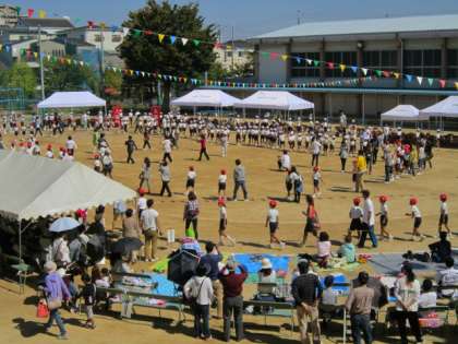 子どもたちは運動会に向けて、地域の菖蒲会の方々に河内音頭をご指導いただきました。今日は子どもたち、教職員、保護者、地域の方々、みんなで輪になって河内音頭を踊りました。