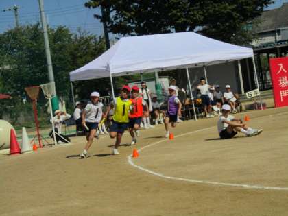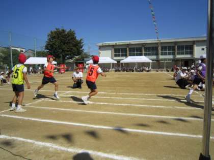 4年生全員によるリレーです。勝利への思いを込めてバトンをつなぎました。追いつき追い抜き抜き抜かれの中、仲間を信じて最後までバトンをつなぎました。