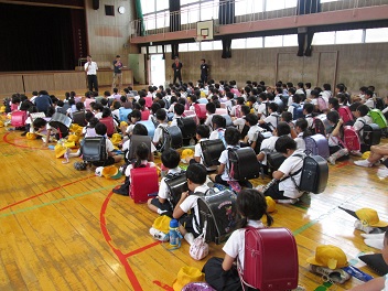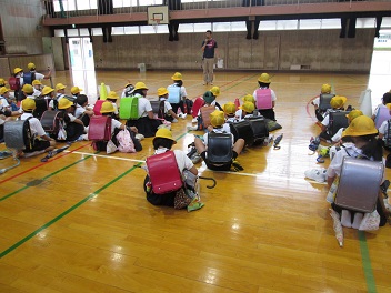 学年ごとに講堂に集合した後、登校班ごとに並び替えて集団下校する訓練をしました。班長が低学年に声かけしながら、すばやく安全に行動することができていました。