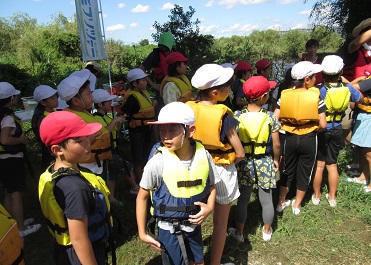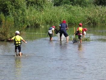 淀川河川レンジャーの方々のご協力を得て、淀川のワンドで生き物を捕ったり、観察したりする活動をしました。理科の学習としてだけでなく、安全に活動することを学ぶ機会でもあり、まずはじめにライフジャケットの扱い方を教えていただきました。