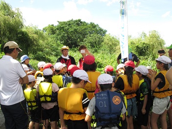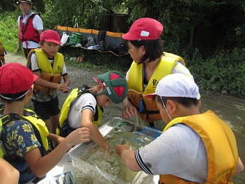 捕った生き物は、水槽に入れてみんなで観察をしました。また、河川レンジャーの方が生き物についての説明をしてくださりました。自分たちが捕ったのがどんな生き物なのか、真剣な目つきで説明を聞いていました。