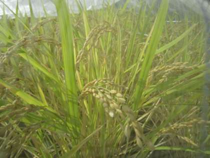 “実りの秋”5年生が栽培しているお米も、収穫の時期を迎えました。青々としていた稲穂が今では薄茶色に色づき、頭を垂れ始めました。