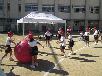 次は、全校みんなで取り組む「大玉おくり」の練習です。