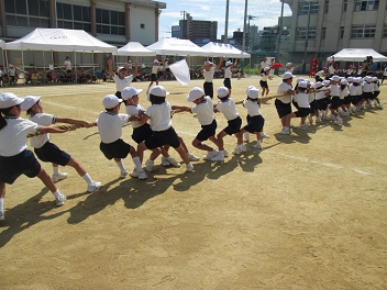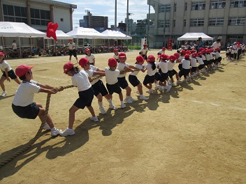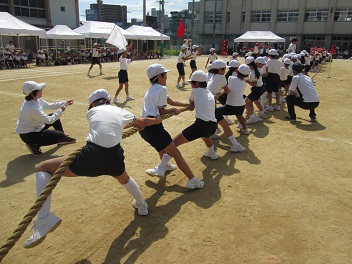 低学年同士、中学年同士、高学年同士で綱を引き合います。