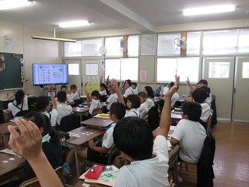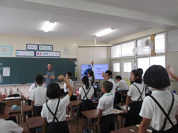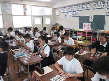 6年生の外国語活動の様子です。今日は、「We have a 〜」の表現を使って、町にどのような施設があるかを伝える活動をしました。
