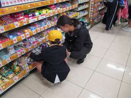 スーパーに到着してからは、子ども用の小さいお買い物かごを持ってお菓子売り場に一直線です。ワクワクした顔で、何にしようかな〜お金は足りるかな〜と悩みながら選ぶ姿がとても印象的でした。