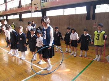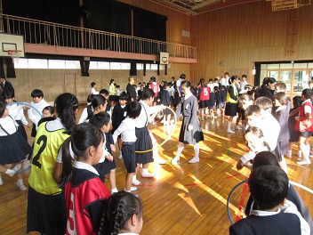 児童集会の様子です。今日はプラフープくぐりでした。班のみんなでつながって、協力してくぐっていきます。