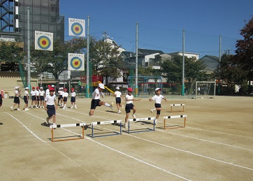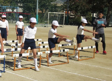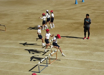 都島区から派遣された講師の方による授業、5年生はハードル走の学習をしていました。まずは、歩きながらハードルを越して、足運びを学んでいました。その後、少しずつ距離や高さを伸ばしていき走りながら跳ぶ練習をしていました。練習を重ねていくうちに正しい跳び方が身についてきて、後ろ脚を横から回せるようにもなってきました。