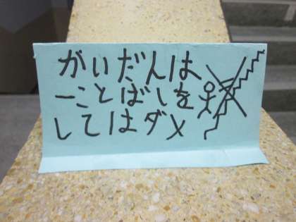 掲示の仕方についても話し合った結果、小さな立て看板のようにして階段の所に置いたり(写真2枚目)、雨の日限定で廊下に置ける看板を段ボールで手作りしたり(写真3枚目)と、アイデア満載の掲示物が出来上がりました。