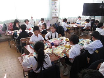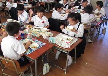 1年生の教室をのぞくと、写真のようにおかわりの列ができていました。