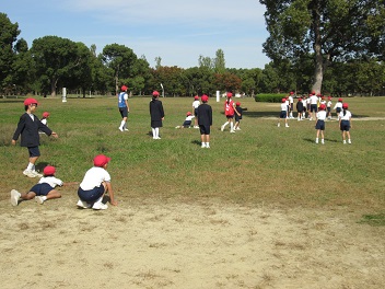 クイズ&ゲームラリーが終わった班から、班遊びをしました。大人数で「だるまさんが転んだ」をしている様子は、微笑ましいというか面白いというか、見ているほうも楽しい気分になりました。