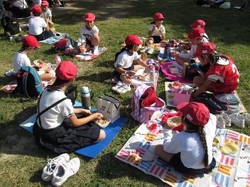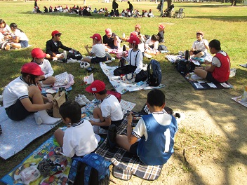 いよいよ楽しみだったお弁当の時間です。お弁当もクラスごとではなく、たてわり班ごとに集まって食べました。笑い声の絶えない班もありましたが、どんな会話をしたのでしょうね。