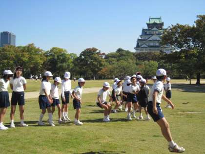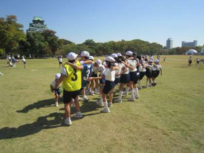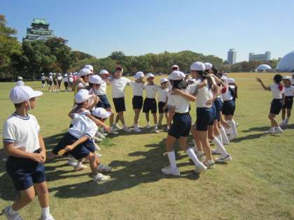 晴天に恵まれ、予定通り全校遠足を実施しました。朝はひんやりしていましたが、大阪城西の丸庭園に着くころにはすっかり温かくなりました。到着してすぐに班ごとに並び替え、大阪城を背景に記念撮影、終わった班から早速班遊びを開始。「だるまさんがころんだ」「はないちもんめ」「ハンカチ落とし」など事前に話し合った遊びを楽しみ始めました。