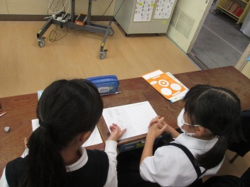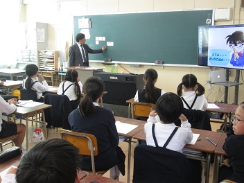 神戸親和女子大学の井上先生を招いての授業の様子です。4年生で面積の求め方の学習をしました。授業の始めに、算数の学習は、名探偵コナンのように「まてよ…、ということは…」と、自分が感じた疑問を解決していくところに面白さがあるということを伝えてらっしゃいました。自分で疑問をもつことで、学習が主体的なものになっていきます。