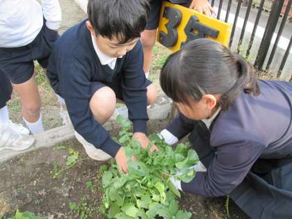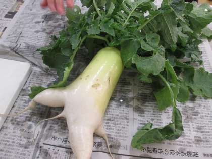 2学期の始めから3年生の学習園で栽培してきた大根が、立派に育ちました。
