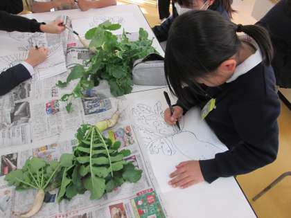 その後、様々な大きさや形の大根を隅々まで観察し、マジックペンを慎重に動かしながら絵を描きました。たくさん葉がついていたり、曲がっていたり、先が2つに分かれていたりと、スーパーなどで売っている見慣れたものとは違う大根の特徴をとらえようと、みんなしっかりと見つめながら描いていました。