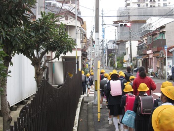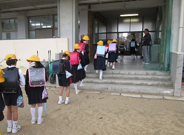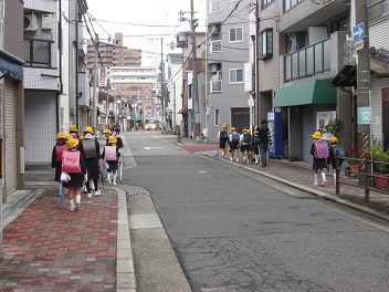 門を出ても、しっかりと並び安全に歩いていました。子どもたちが安全に登下校できる、そんな当たり前のことがずっと続く学校でありたいと思います。道中では「見守り隊」の方々が子どもたちが安全に帰ることができるように、声をかけてくださったり、横断歩道で誘導してくださったりしていました。