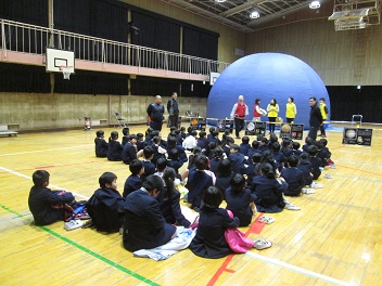 大阪市立科学館による「モバイルプラネタリウム」を実施しました。なんと!講堂の中にドームを張って、プラネタリウムセットができあがりました。講堂に入った子どもたちは、いつもと違う雰囲気に不思議な表情をしていました。