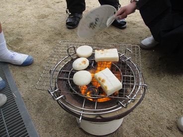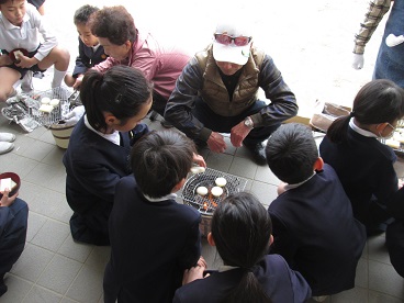 焼きあがるのが楽しみという雰囲気が伝わってきます。おいしくいただいた後は、多目的室に移動して、地域の方々との交流会。昔の暮らしや地域の様子について、いろいろなお話を聞かせていただきました。