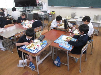 今日の給食は「豚肉と金時豆のカレーライス・ごぼうサラダ・プチトマト」でした。写真は1年生の給食の様子です。4時間目は体育だったので、おなかもよく空いていたようで食缶の中は、すっかり空っぽになっていました。