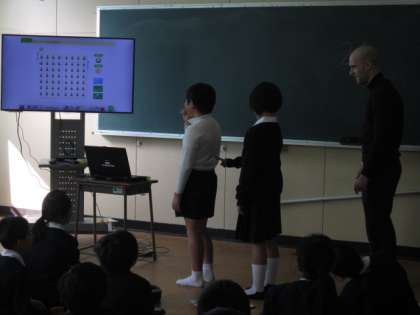 5年生はアルファベットゲーム。グループ毎に背中に「A」「G」などのアルファベットを指でなぞっていき、速さと正確さを競い合います。