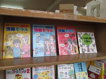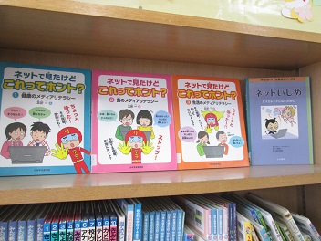 今の子どもたちの課題の一つ、ネット関連の本も並んでいます。また、調べ学習に活用できるようにテーマに沿った本や新聞の切り抜きもまとめられています。
