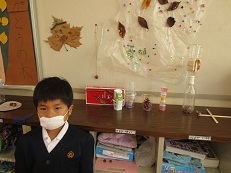 11月5日に内代公園に行きました。すっかり秋らしく木々が色づいていました。グループで観察したり、落ち葉や木の実を拾ったりして帰りました。また、休みの日にもどんぐり・まつぼっくり・落ち葉を拾ってきました。それらを使って、自分で作りたいものを工夫して楽しく作りました。「カレンダーをつくったよ。」、「顔を作った。」、「どんぐりゴマややじろべえを作るから、穴をあけてください。」等々、わいわい言いながらいろいろな作品ができました。