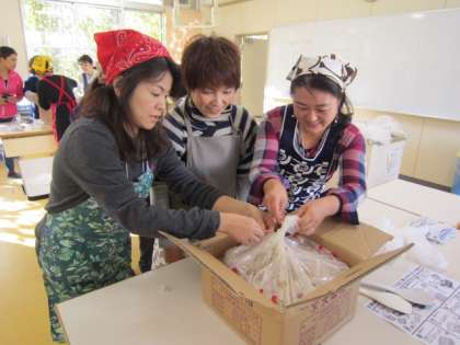 家庭科室では、早朝より、PTAの方々、地域の方々が協力して大阪市災害救助用アルファ化米を400食お湯で戻し、小分けしてくださいました。