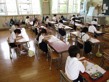 分散登校が始まって2週間が経とうとしています。静寂に包まれていた校内に、少しずつ子どもたちの歓声と笑顔が戻ってきました。気温も高くなり始める中、2〜6年生にとっては久しぶりの、1年生にとっては初めての授業となりますが、みんな一所懸命に励んでいます。