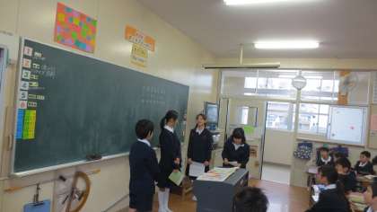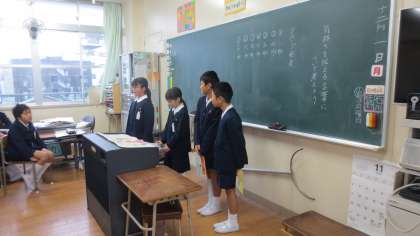 国語科の学習で「気持ちが伝わる言葉」について考えました。お礼を言う時、断る時、謝る時、やめてほしい時、ものを頼む時、人と関わる中で様々な状況があります。どんな風に言葉を遣えばいいかをグループで話し合い、発表しました。発表の形はニュース形式、ペープサート、劇、クイズ形式、などで台本を作り進めました。ニュース形式は解説者とキャスターの他に役柄を決め、伝わらなかったパターンと伝わったパターンの違いを演じます。一部をご紹介します。