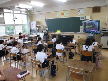 今までは雨が降った時は、職員室のマイクを通し音声だけで「放送朝会」をしていたのですが、今日は、教室の大型テレビを通しての朝会にチャレンジしました。いわゆるオンライン朝会です。インターネットを通して、職員室のパソコンから各教室のパソコンへ音声だけでなく画像も届け、子どもたちがそれを視聴するという形です。