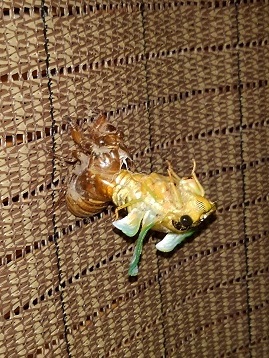 家(本校教職員)のバルコニーのすだれについていたクマゼミの幼虫が、夜中に羽化しました。羽化には約1時間もかかりました。