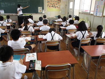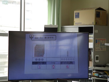 大型テレビには、子どもたちの手元にあるプリントと同じプリントが映し出されていました。ICT機器を活用することで分かりやすさが高まります。