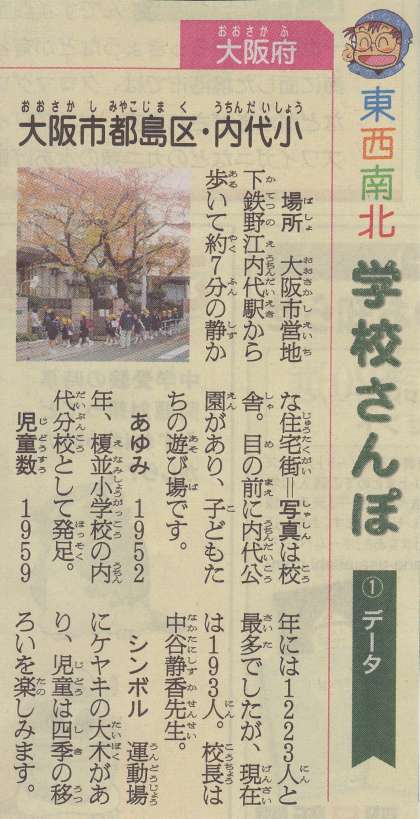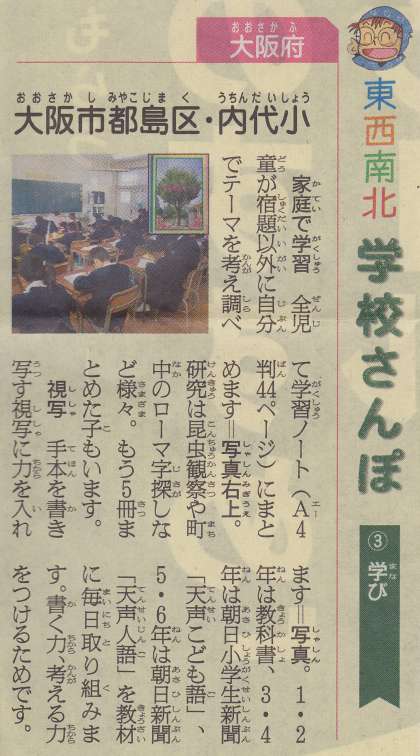 先日プリントにてお知らせしました通り、先週(12月8日〜12日)の5日間にわたり、朝日小学生新聞の『東西南北 学校さんぽ』の欄に本校教育について紹介されました。その内容を紹介します。