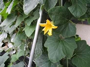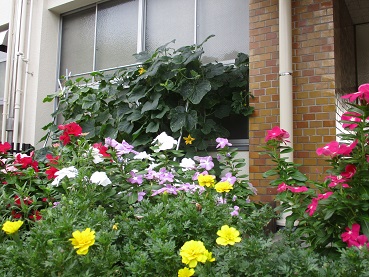 玄関に咲く色とりどりの花の向こうには、緑のカーテン。