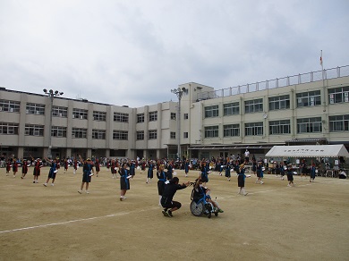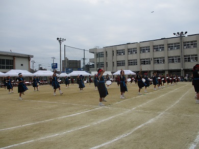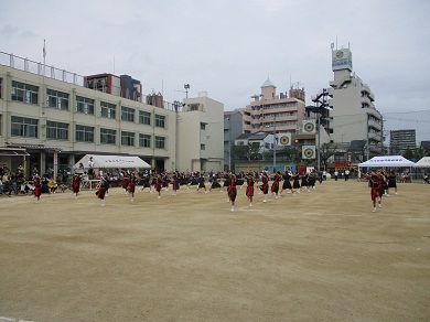 3・4年の団体演技の様子です。沖縄の舞踊エイサーの曲にのって、パーランク(手持ち太鼓)を響かせました。
