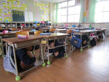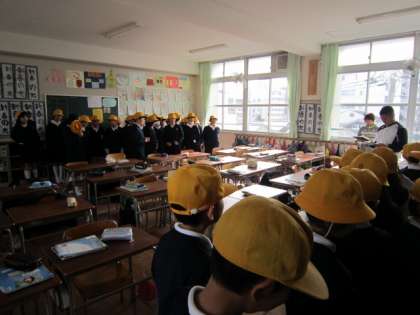 その後、津波警報が発令されたとの想定で、再度、校舎の3階に避難します。1年と6年、2年と5年、3年と4年がペアとなり同じ教室へ避難しました。上級学年の子どもたちには、いざという時には下級生も守ってあげなくてはという姿勢や表情が見て取れました。