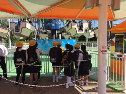 子どもたち、みな元気に楽しそうに飛び回っています。乗り物も一部席を開けるなどしてるためか、平年より混み気味です。