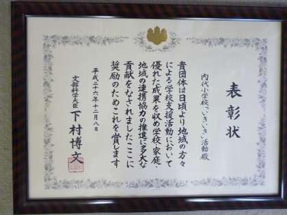 内代小学校「いきいき」活動が昨年末(平成26年12月8日)に「学校・家庭・地域の連携協力の推進に多大な貢献をなされた」ということで文部科学大臣から表彰を受けられました。「自然や文化に親しみ、豊かな心情を培う」ことをめあてに普段から、学校と同じように体験をたくさん取り入れ、子どもたちに本物に触れさせることを心掛けた活動をたくさん取り入れておられます。大阪市で2校が受賞されたそうです。おめでとうございます。