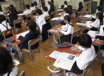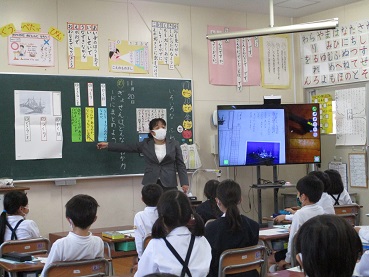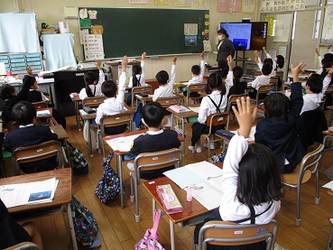黒板と大型テレビの両方を使って、視覚的にも分かりやすく、子どもたちの意欲も高まる工夫がされていました。元気よく手が挙がっています。