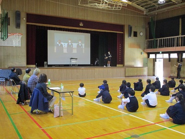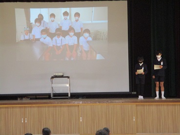 司会は5・6年の健康委員会の子どもたちです。はじめに、講堂の大型スクリーンにスライドを映して、健康委員会の1年間の活動を紹介しました。次に、感染症予防を呼びかける寸劇をおこないました。