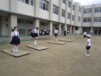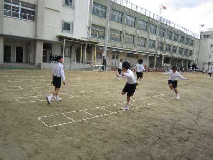 全校一斉のなわとびが終わった後も6年生は自主練習をしていました。縄をとびながら、リズミカルにラダートレーニングをしている子もいました。6年生の技に1年生が見とれていました。