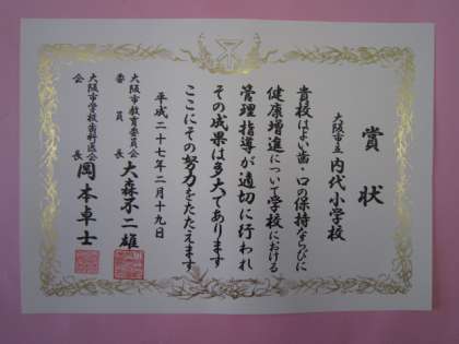 今年も「よい歯・口の保持ならびに健康増進」に関して管理指導が適切に行われ成果をあげているということで表彰をしていただきました。学校では、「歯科校医先生による検診」「歯と口の健康教室」「4年生フッ化物塗布」「2年生歯磨き指導」等を通して子どもたちが歯を大切にしようとする意識を高めてきました。もちろんおうちにおける歯磨きの習慣、バランスのとれた食事がよい歯の維持を支えていることは言うまでもありません。よい歯は健康なからだ作りに欠かせません。学校ではこれからも保健指導を充実させ、❝自分の健康は自分で守る❞という意識の高い子どもたちにしていきたいと思っています。これからも、ご協力をよろしくお願いいたします。