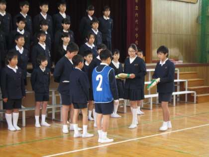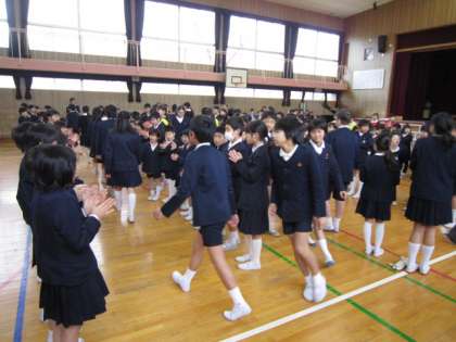 6年生から在校生には手作りの雑巾が送られました。最後に、在校生の作った花道を通り、6年生が退場して行きました。心温まる「卒業を祝う会」となりました。