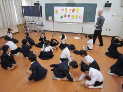 C-NETとしていつも5・6年生の英語活動の指導をしてくださっているSmith先生が、高倉中学校の授業の合間をぬって、今日は3・4年生の英語活動の指導に来てくれました。今日は“fruits”を題材にした学習でした。12種類の絵カードの中からキーカードを選び、Smith先生が言ったfruitsがキーカードのfruitsのときに、前に置かれたマグネットをいち早く取った方が勝ちというゲームや“What fruits do you like?”という問いに、前に立った数人の子どもたちが一斉に“I like apples”“I like strawberries” “I like bananas”と言い、聞いている子どもたちが誰がどのfruitsを好きと言ったのかを聞き取るというゲームなどをしました。