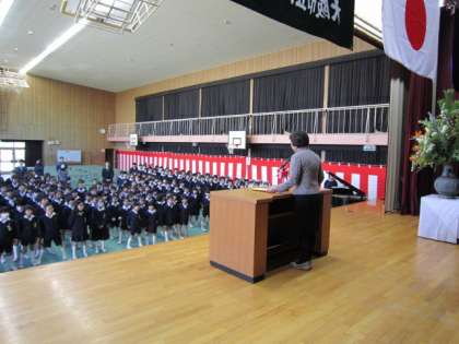 学校長からは「身の周りのことを当たり前と思わず、何でやろうという目でまわりの出来事を見ましょう。すると、いろいろな疑問が湧いてきてどんどん調べ、たくさんの知識が身に付きます。また、最初から、自分にはできないとあきらめず色々なことに挑戦しようということを校長先生は1年間言ってきました。皆さんは1年間そのように頑張れましたか?頑張ったけれどできなかったということがあるかもしれません。でも大丈夫。頑張った経験、努力が大切なのです。その努力は無駄にはなりません。今日はそんな頑張りをいっぱい詰め込んだ通知表と修了証を担任の先生からいただきます。4月8日の新しい学年の始業式には、新しい先生や友達との出会いが待っています。元気に登校しましょう。」と話しました。安全に健康に春休みをすごしてほしいと思います。