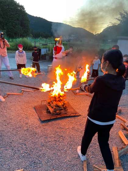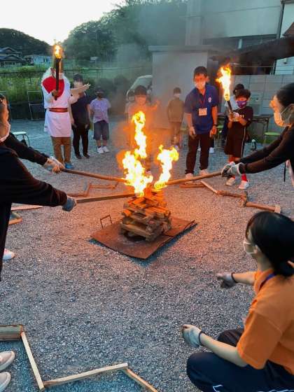 火の神様からいただいた火を力を合わせて点火します!