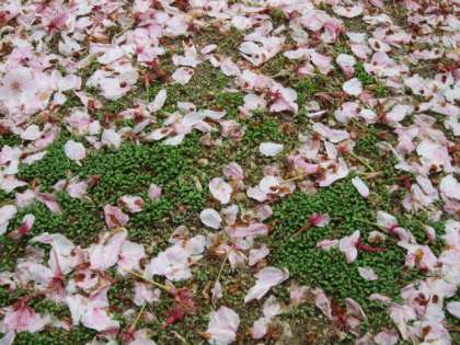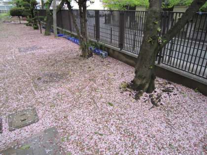 校舎の南側には桜の木が8本植えられていて、春には満開の桜の花でトンネルのようになります。今年は桜の開花に合わせるかのように雨の日が続き、桜の花を愛でるのもままならない程早々に葉桜となってしましました。しかし、校庭には桜の花びらが一面に敷き詰められ、花は散っても今なお私たちの目を楽しませてくれています。